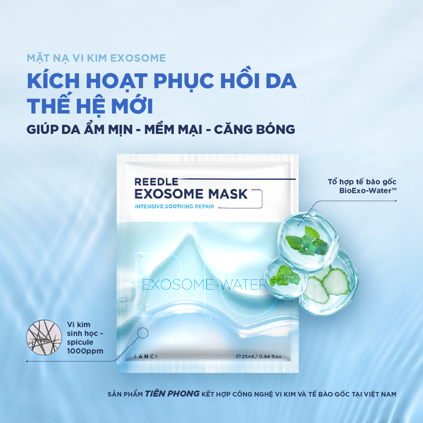 Mặt nạ Vi kim Exosome LANCI là sự kết hợp giữa Vi kim sinh học và Exosome tinh khiết, tạo nên cơ chế MỞ ĐƯỜNG – DẪN DƯỠNG CHẤT – PHỤC HỒI DA vượt trội.