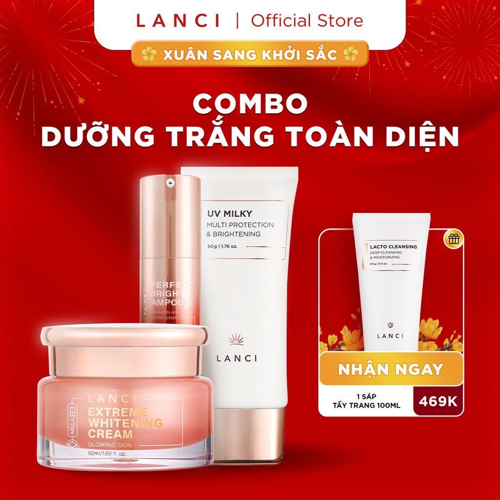 Bộ dưỡng trắng da toàn diện LANCI giúp da bật tông trắng mướt, đồng thời dưỡng da trắng sáng từ sâu bên trong nhờ 3 hoạt chất tác động đồng thời: Tranexamic acid, Niacinamide, Glutathione - Cùng Sữa chống nắng dưỡng ẩm.