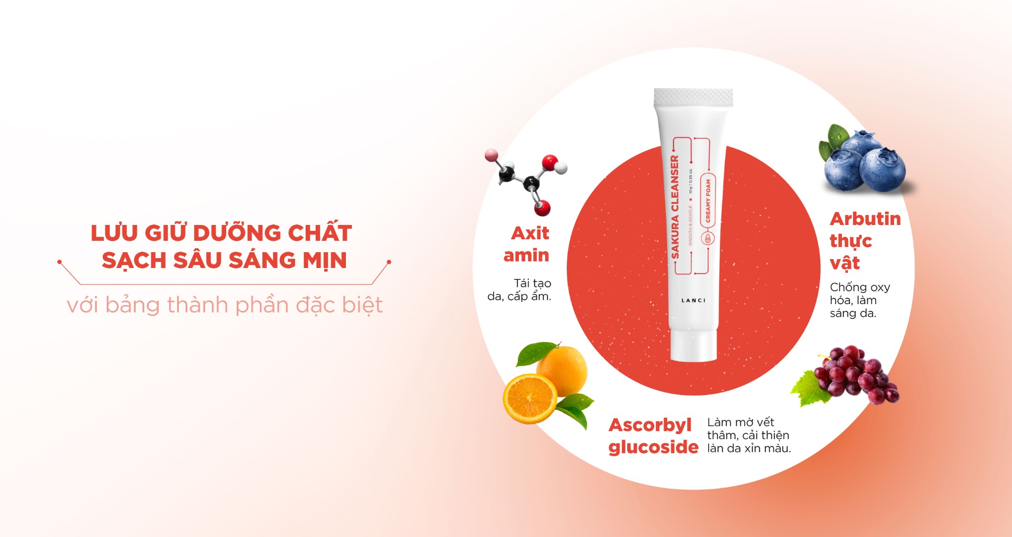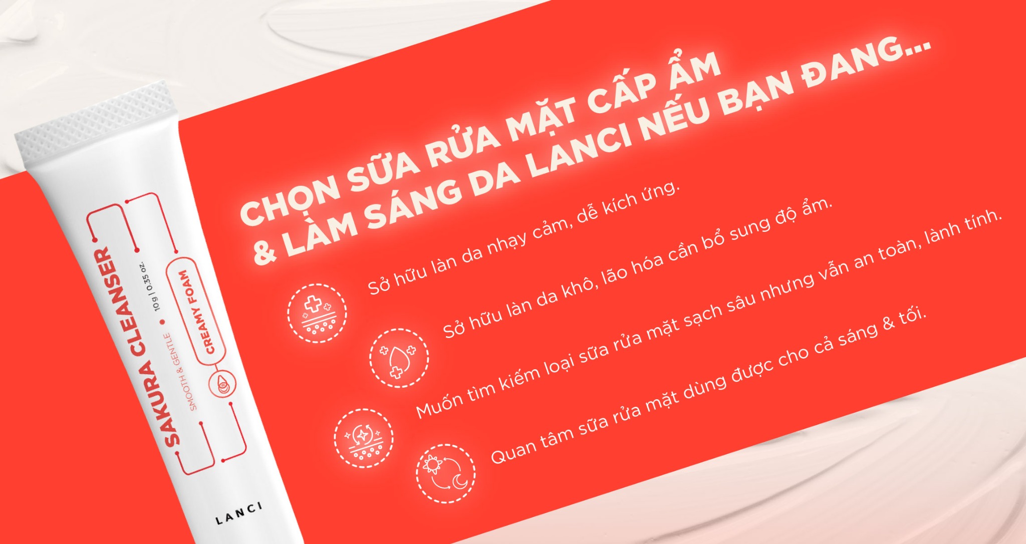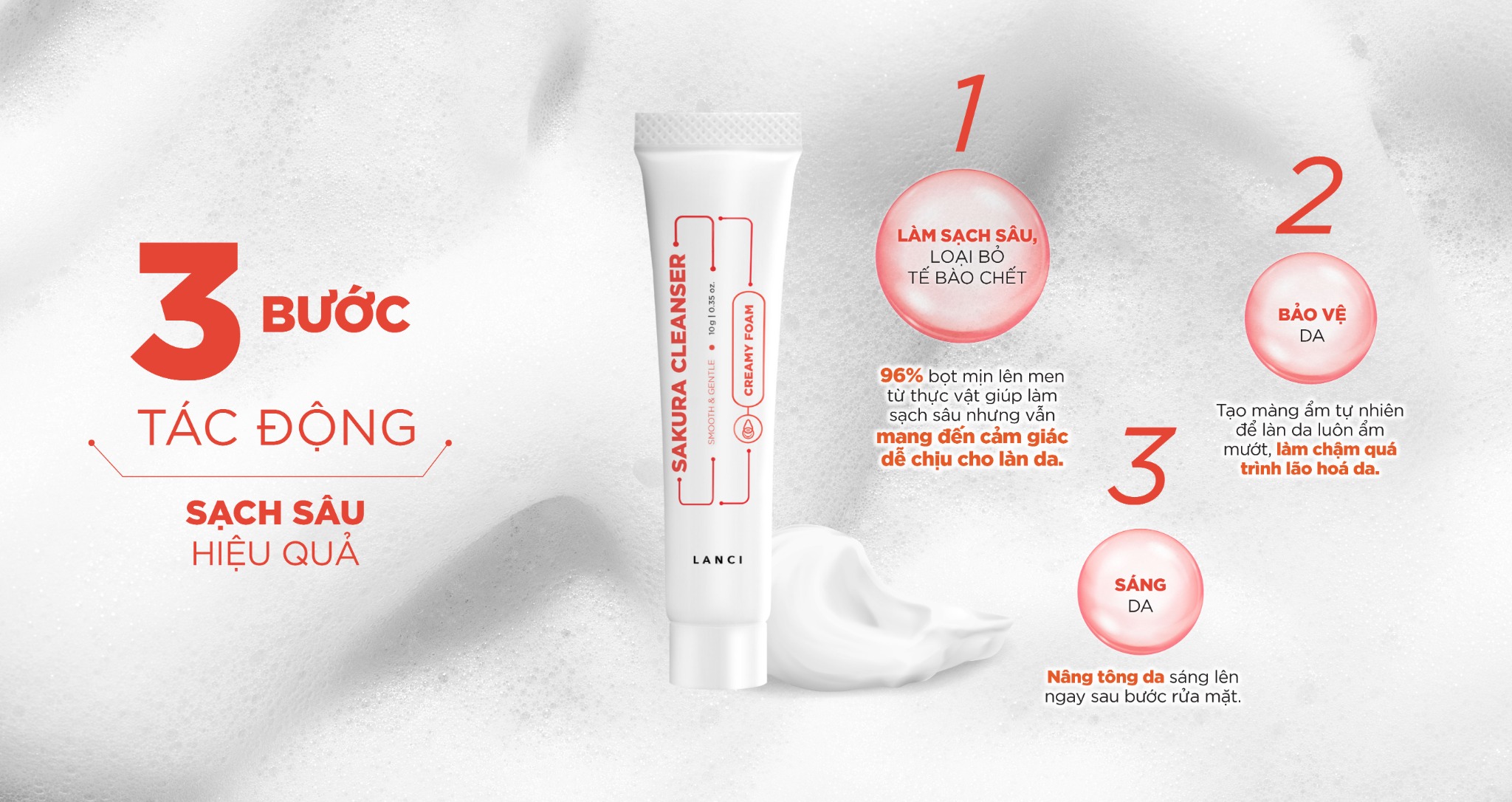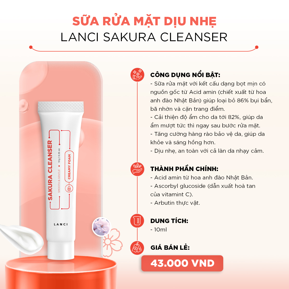 Sữa rửa mặt dịu nhẹ LANCI Sakura Cleanser với kết cấu dạng bọt mịn từ acid amin giúp loại bỏ 86% bụi bẩn, bã nhờn và cặn trang điểm mà vẫn giữ nền da luôn ẩm mịn.